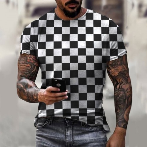 Round neck black and white plaid creative T-shirt HF2214-02-04